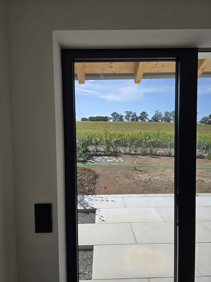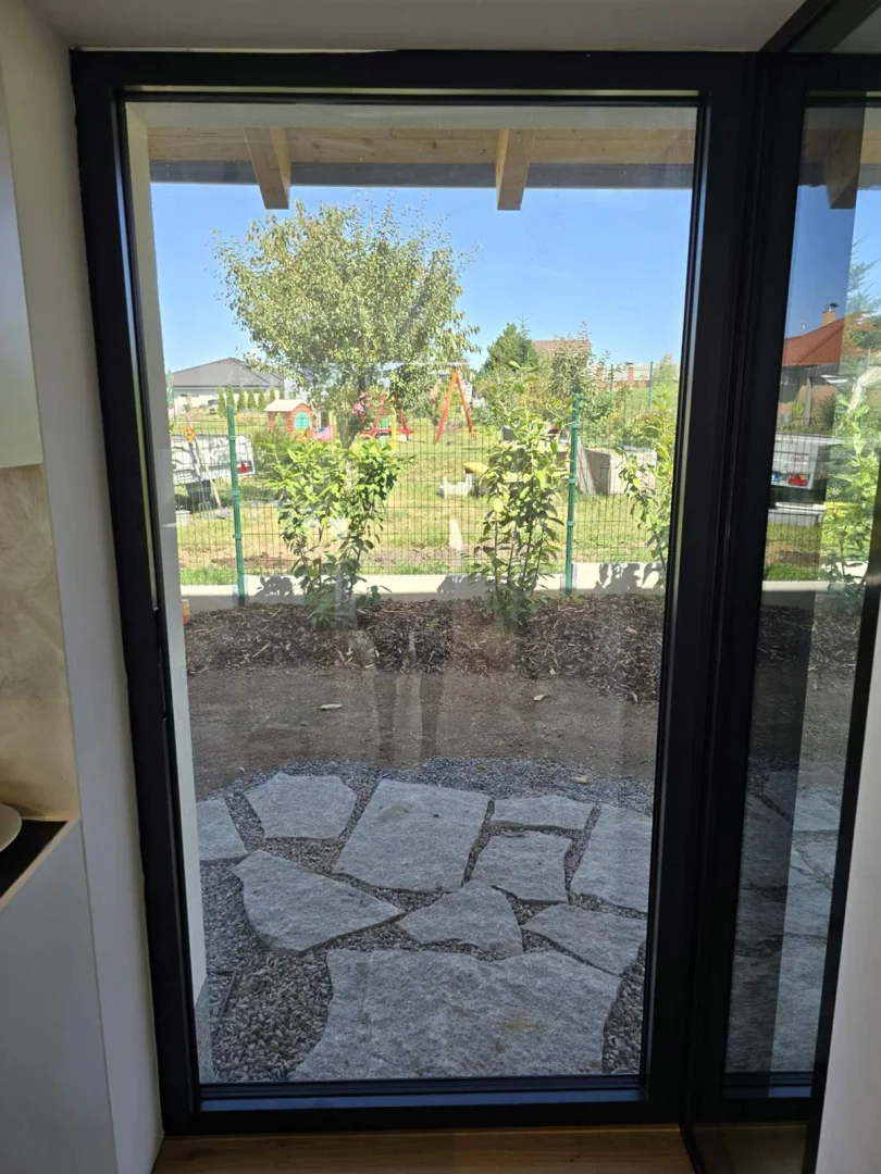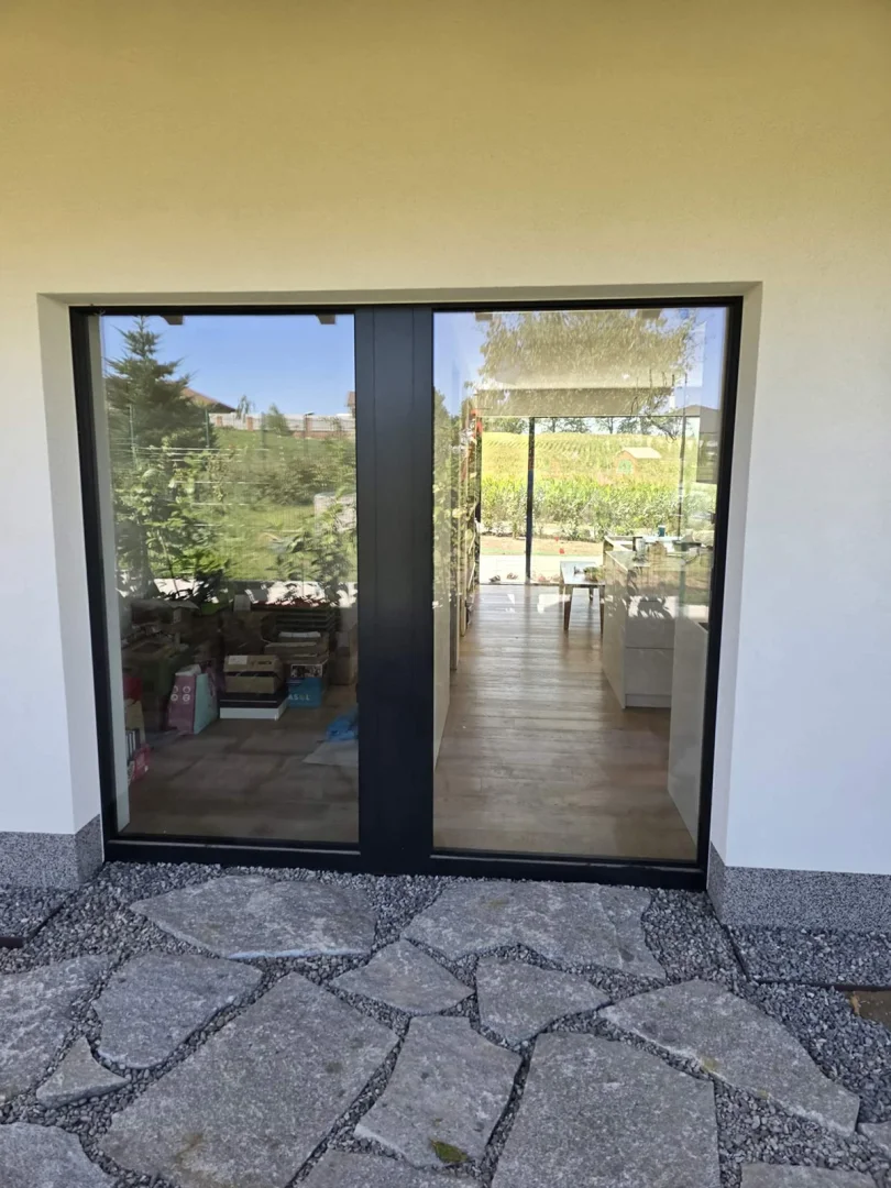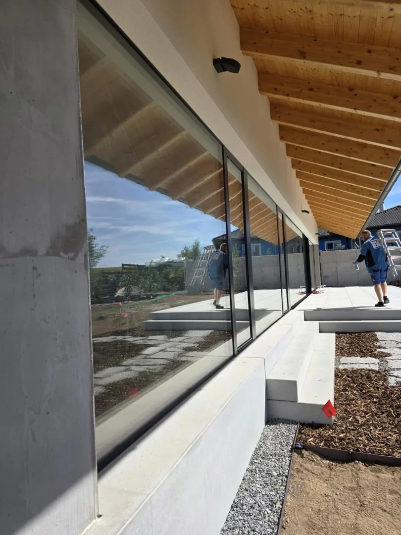 V nedávné realizaci jsme dodali bezrámová okna, dveře a především velkoformátovou posuvnou stěnu v systému SEDMA Panoramata. Právě tato stěna se stala dominantou celého domu – otevírá interiér směrem do zahrady a poskytuje ničím nerušený panoramatický výhled. Díky bezrámovému řešení působí sklo lehce a elegantně, přičemž zachovává maximální funkčnost i komfort užívání.