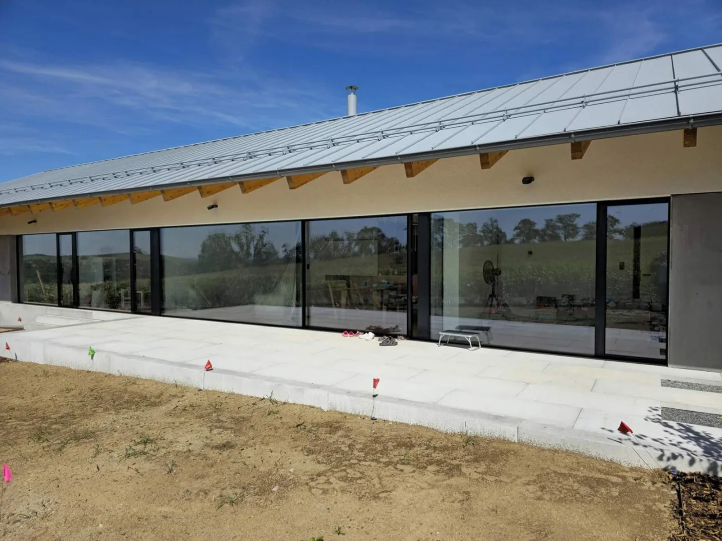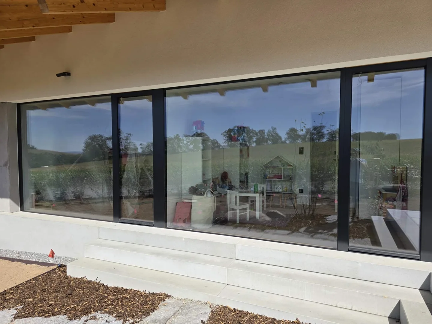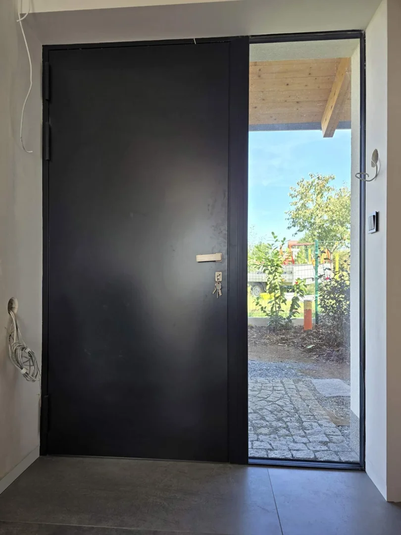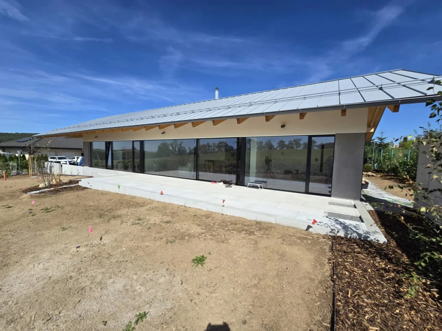 V nedávné realizaci jsme dodali bezrámová okna, dveře a především velkoformátovou posuvnou stěnu v systému SEDMA Panoramata. Právě tato stěna se stala dominantou celého domu – otevírá interiér směrem do zahrady a poskytuje ničím nerušený panoramatický výhled. Díky bezrámovému řešení působí sklo lehce a elegantně, přičemž zachovává maximální funkčnost i komfort užívání.