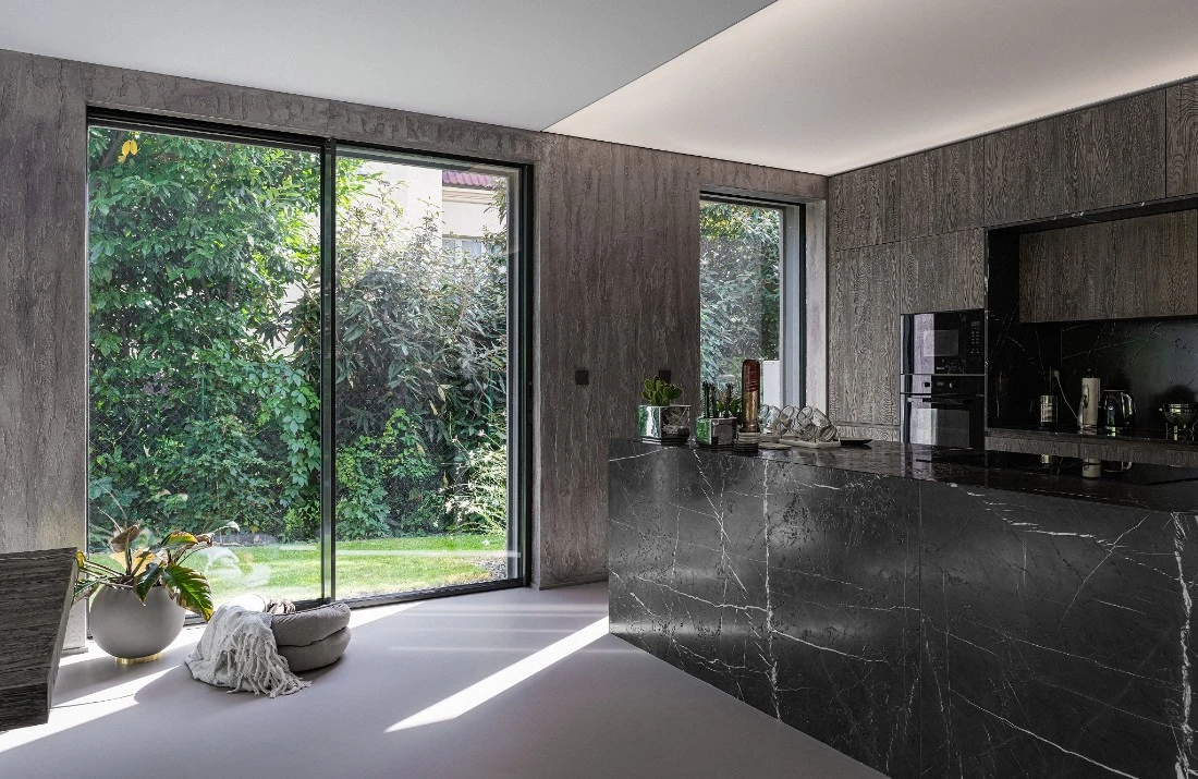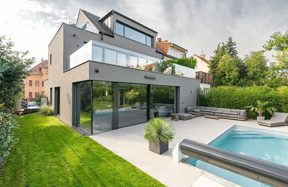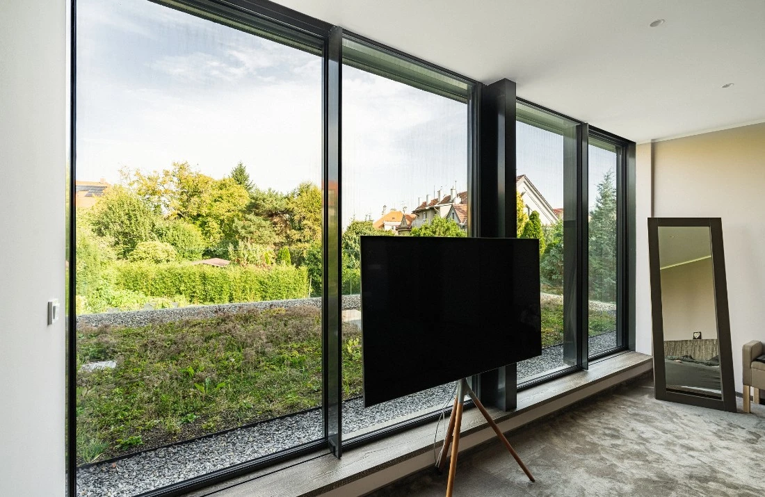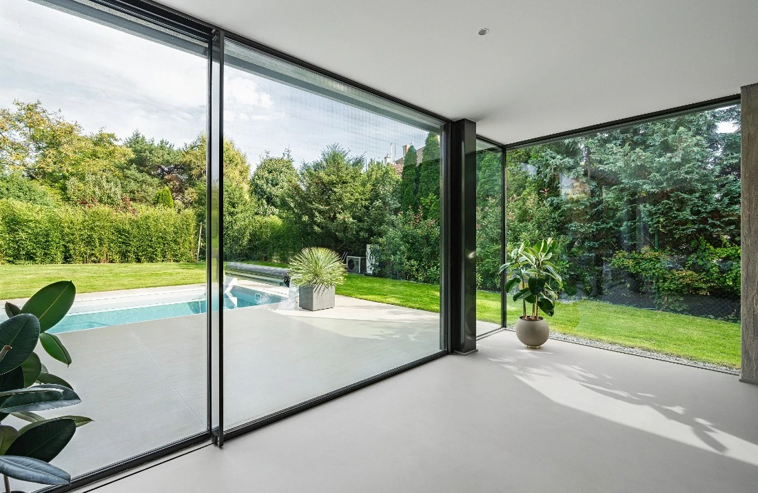 Bezbariérové řešení se skrytým prahem u posuvných bezrámových dveří bylo přání investorky, která si rekosntrukcí zajistila pěkné nové bydlení s přírodou.